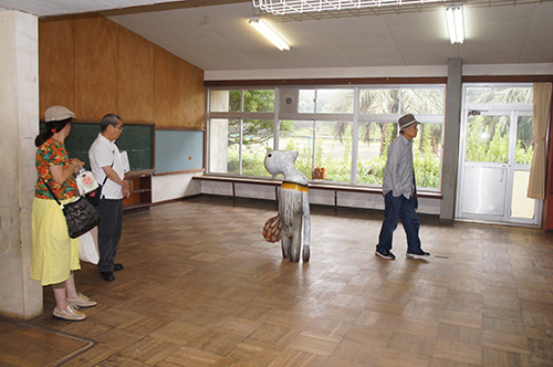 高速バスで約2時間かけて浜松町へ行き、竹芝から高速船に乗る。東京湾航行が海外旅行の出発に似た奇妙な浮遊感に陥るのは、波や船内の強烈な冷房のせいだけではないだろう。2時間弱で伊豆大島・元町港へ到着。バスでメイン会場の元・波浮小学校まで更に約40分。会場に着いた僕は、自分ではない自分が背後に潜んでいるような気がした。日常の時空間から乖離したことの自覚だろうか。そのようにして昨年僕は大島へ4回渡航した。